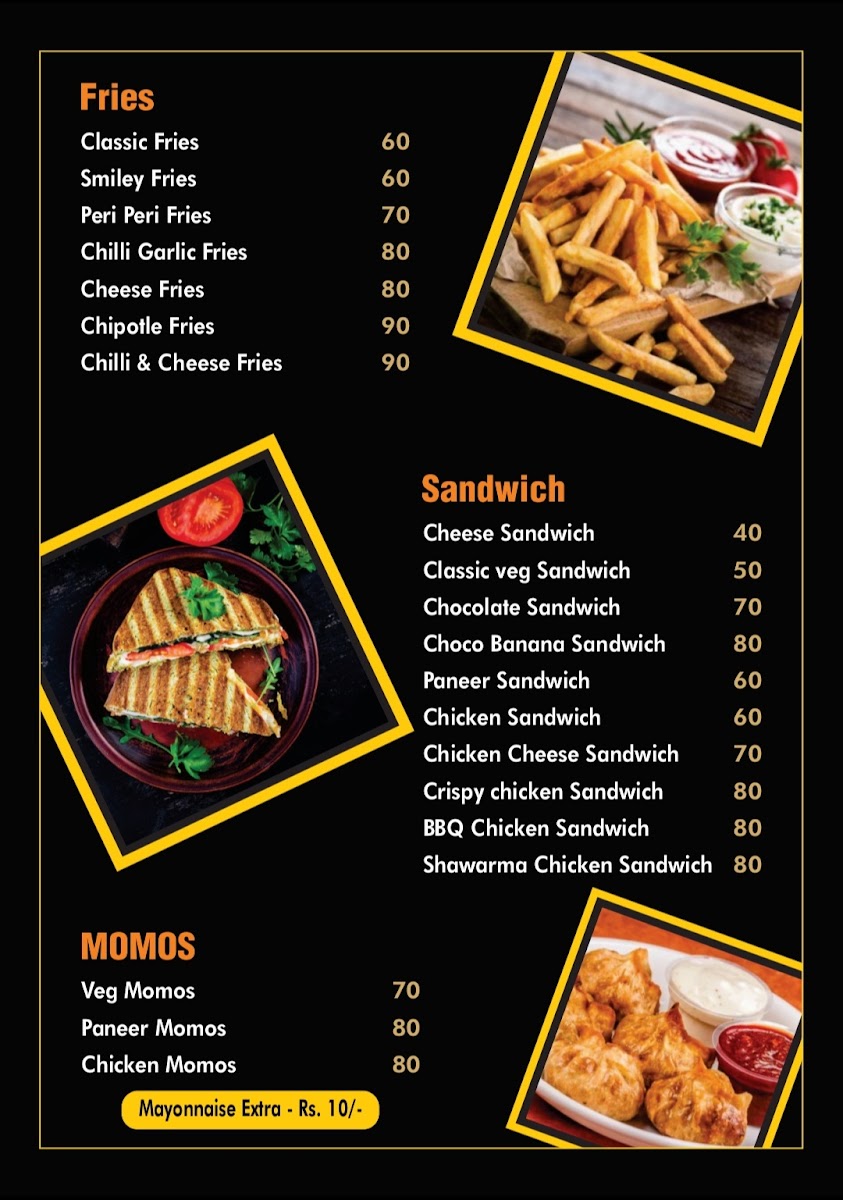 - Snacks: Indulge in delightful choices such as Bread Omelet, Garlic Bread, and Chicken Popcorn.